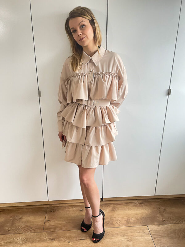 Koszulowa sukienka z dziewczęcymi falbanami w kolorze beżowym. Model zapinany jest na ozdobne guziki, rękawy ma zakończone mankietami. W zestawie z sukienką jest szeroki, materiałowy pasek, który pięknie podkreśli talię i dopełni stylizację. Ten model sukienki sprawdzi się w oficjalnym wydaniu jak i w codziennych stylizacjach.