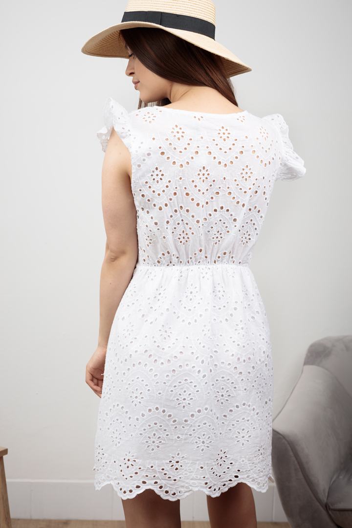 Delikatna, ażurowa sukienka w stylu boho. Model posiada z tyłu w pasie gumkę, dzięki czemu idealnie dopasowuje się do sylwetki. Falbanki przy ramionach dodają jej dziewczęcego uroku.  Sukienka jest lekko prześwitująca, posiada podszewkę od pasa w dół. Bardzo lekka i przewiewna.