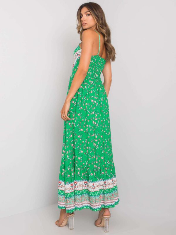 Długa, zwiewna sukienka to MUST HAVE każdej letniej szafy. Nasz model jest lekki i przewiewny, w pięknym zielonym kolorze we wzory. Sukienka jest na regulowanych ramiączkach, z przodu ma zakładany dekolt a z tyłu pięknie odkrywa plecy. Dół sukienki zakończony jest falbaną, która dodaje jej lekkości i dziewczęcego charakteru. Ta sukienka sprawdzi się w każdej letniej stylizacji, będzie świetnie wyglądać z obcasami ale też z klapkami czy trampkami.