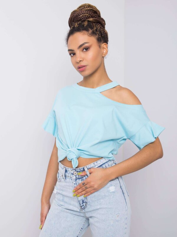 Jasnoniebieska, basicowa bluzka o kroju oversize z fantazyjnie wyciętym ramieniem. Rękawy zakończone falbanką, która dodaje jej lekkości i wakacyjnego klimatu.Ten model będzie stanowił świetną bazę do wielu codziennych stylizacji.