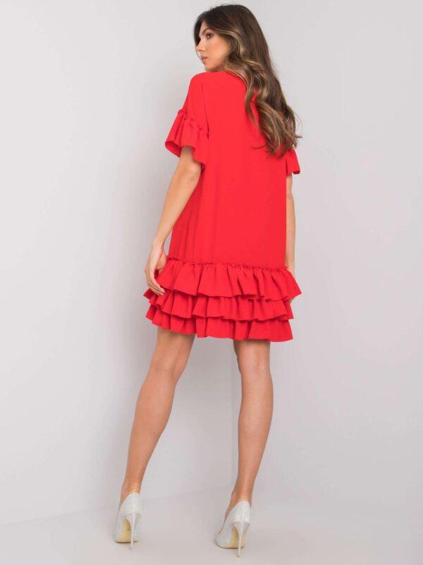 Ta czerwona sukienka to idealna propozycja na wyjście. Możesz ją założyć na wesele, rodzinne przyjęcie albo randkę z ukochanym. Sukienka ma luźny krój, jest dosyć szeroka, na dole ma piękne falbany, które dodają jej lekkości. Rękawy również zakończone są efektowna falbanką. Uszyta jest z delikatnego, przewiewnego materiału. Będziesz w niej wyglądać bardzo kobieco i modnie.